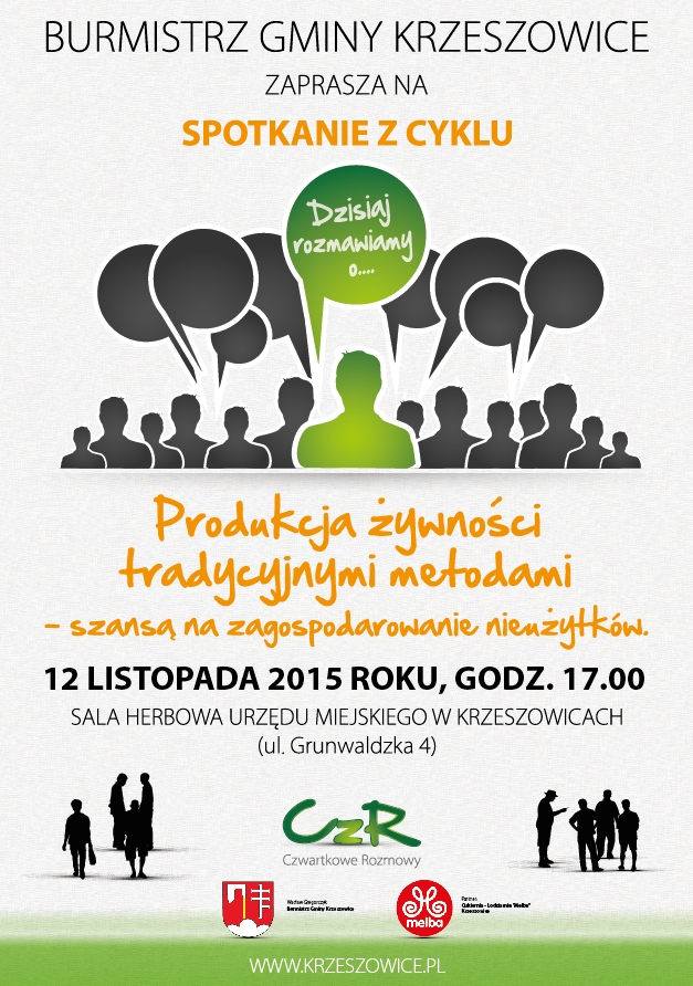 Burmistrz Gminy Krzeszowice serdecznie zaprasza na kolejne spotkanie z cyklu „Dzisiaj rozmawiamy o…”, które odbędzie się 12 listopada o godzinie 17:00 w Sali Herbowej Urzędu Miejskiego w Krzeszowicach (ul. Grunwaldzka 4). Dyskusja będzie poświęcona tematyce związanej z rolnictwem, ogrodnictwem, produktem lokalnym, żywnością ekologiczną oraz utrzymaniem gruntów we właściwej kulturze rolnej pod hasłem: Produkcja żywności tradycyjnymi metodami - szansą na zagospodarowanie nieużytków.